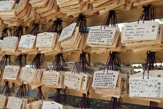 Sotto un albero di canfora c’è un posto dedicato agli Ema, tavolette di legno dove in qualsiasi lingua si può scrivere il proprio desiderio… qui potete scegliere tra i Kigan – Ema che hanno raffigurato lo stemma del santuario e gli Eto – Ema dove viene raffigurato lo zodiaco dell’anno in corso.